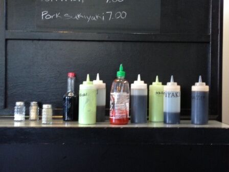 ワサビ、テリヤキ、スパイシーとたくさんソースがたくさん置いてあった。